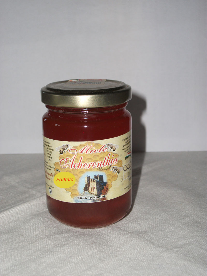 Miele Acherenthia con aggiunta di frutta. Prezzo per vasetto da 280 grammi. Gusti a scelta